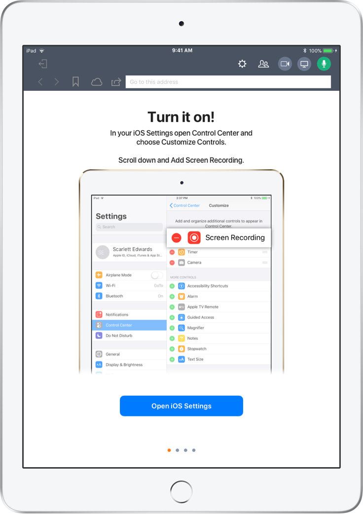 In the first step of the tutorial, shown only to first time users, the user sees they must customize their Control Center settings to enable Screen recording. The button takes them directly there, so they can complete this step before proceeding.